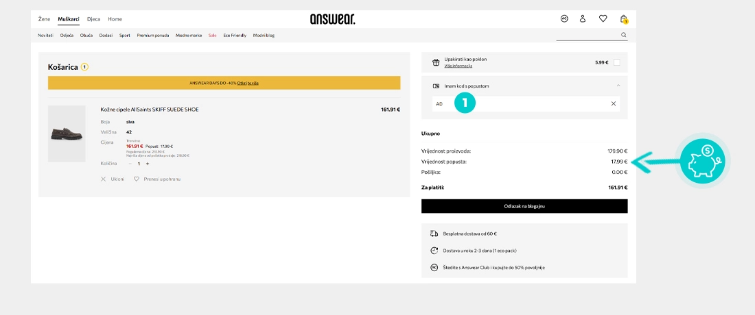 U e-trgovini Answear.hr odaberite proizvod koji vas zanima, pritisnite gumb "Dodaj u košaricu" i proizvod će automatski biti dodan u košaricu. Izravno u košarici pronaći ćete polje "Unesite kod za popust" u odjeljku "Sažetak" s desne strane. Ovdje zalijepite kopirani kod za popust ili ga unesite ručno i potvrdite tipkom "Primijeni".