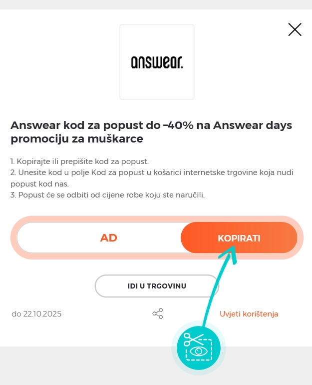 Odaberite određeni kod za popust na našoj web stranici koji želite koristiti u Answear.hr e-trgovini. Pritisnite narančasti gumb "Prikaži kod".