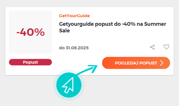 Visina popusta: -40%Popust do –50% odnosi se na promociju Black Friday u trgovini Getyourguide.com. Iskoristite popust GetYourGuide i kupujte jeftinije.