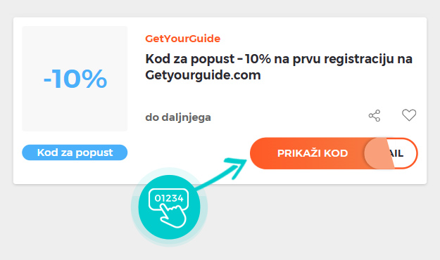 Visina popusta: -15%U eshopu Getyourguide.com naći ćete popuste – 10% na prijavu na newsletter na prvu registraciju. Kod dobivate prijavom na e-mail. Popust ostvarujete kada uneste kod za popust u košaricu Iskoristite GetYourGuide kod za popust i kupujte jeftinije.