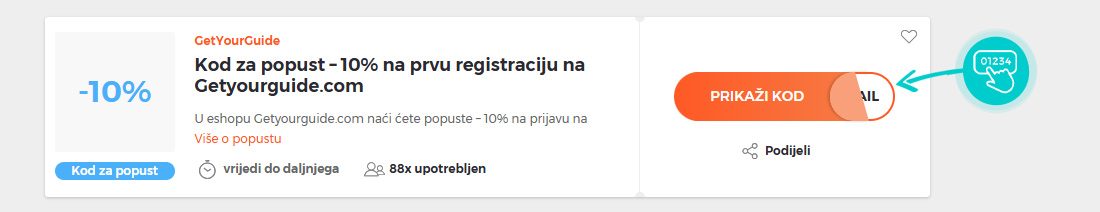 Na našoj web stranici pronađite važeći GetYourGuide kod za popust koji želite iskoristiti. Kliknite na narančasti gumb „Prikaži kod“.