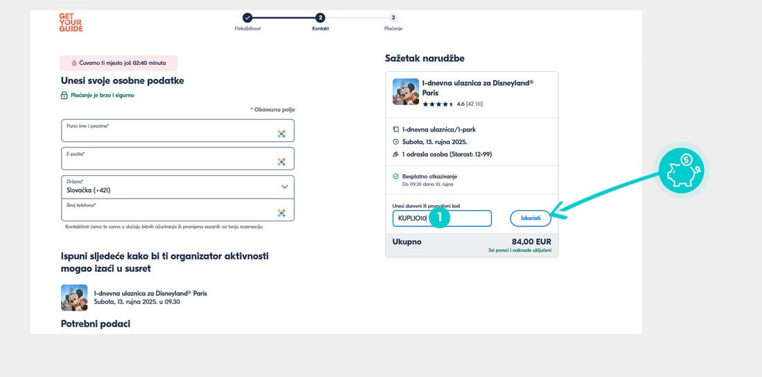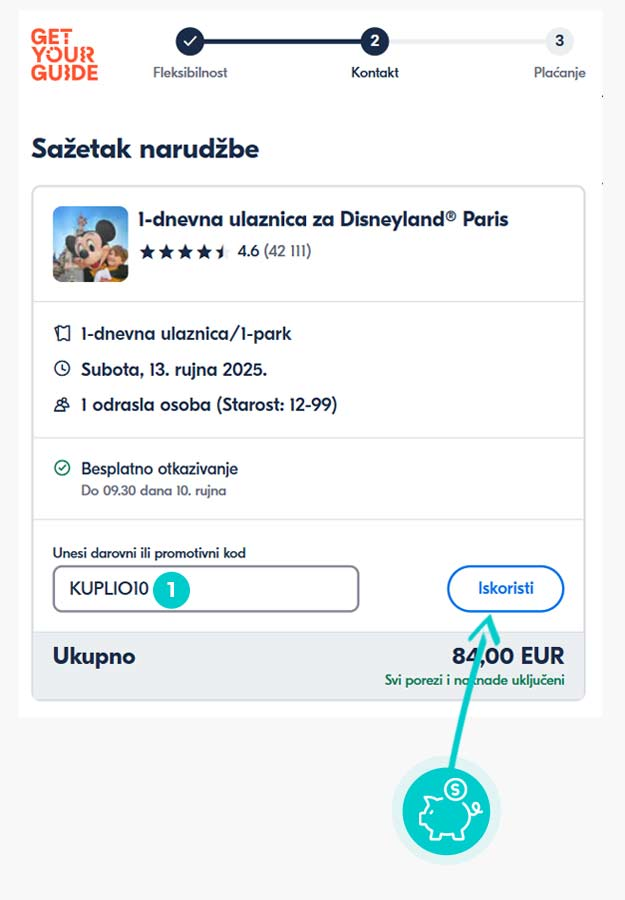 Niste sigurni kako koristiti kodove za popust na GetYourGuide.com? U nastavku vam donosimo jednostavan vodič kako brzo i lako iskoristiti promotivne kodove prilikom rezervacije aktivnosti i tura:
