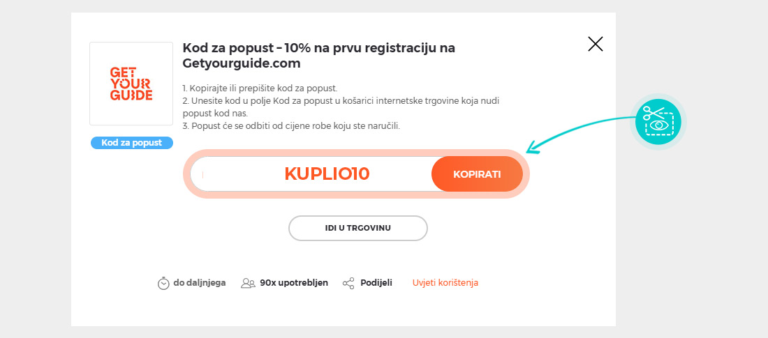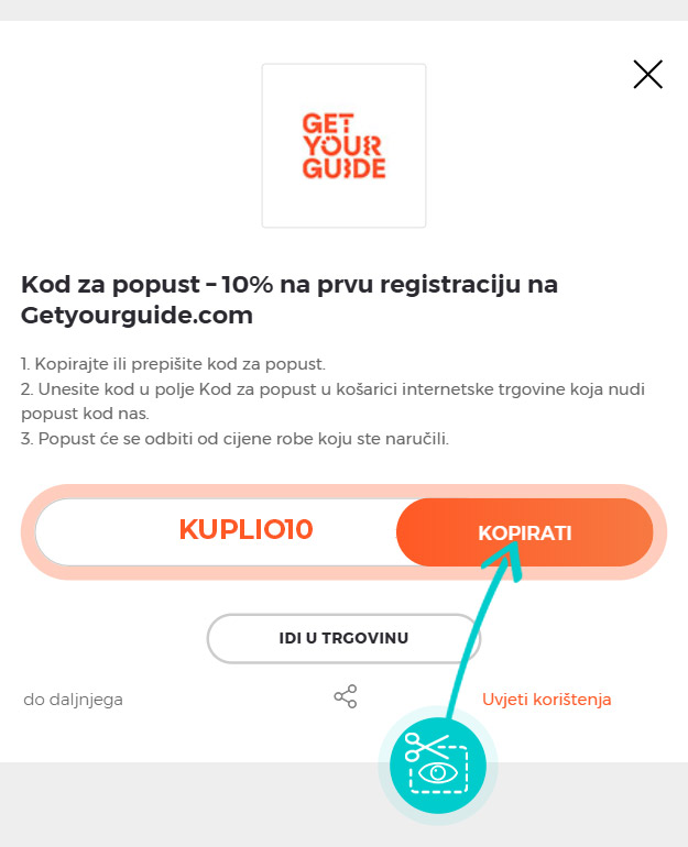 Kopirajte prikazani kod i kliknite na gumb „Idi u trgovinu“. Automatski ćete biti preusmjereni na GetYourGuide.com.