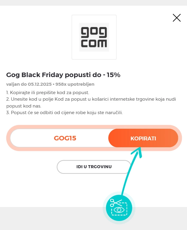 Kopirajte ili zapišite kod za popust i kliknite gumb "Idi u trgovinu". Zatim ćete biti preusmjereni izravno na Gog.com e-trgovinu.