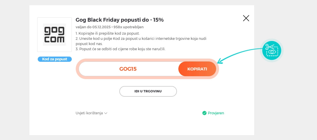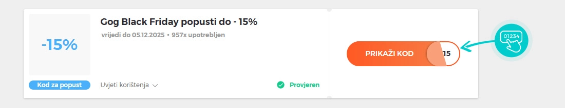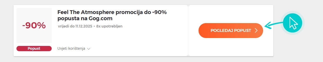 Odaberite određeni GOG popust na našoj web stranici i kliknite gumb "Pogledaj popust". Automatski ćete biti preusmjereni izravno na promotivnu ponudu u online trgovini GOG , gdje možete kupiti proizvod s popustom.