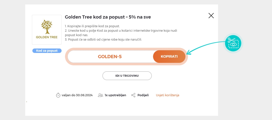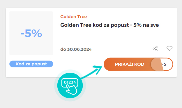 Na našoj web stranici pronađite kod za popust koji želite iskoristiti u GoldenTree.hr e-trgovini i kliknite na narančasti gumb "Prikaži kod".