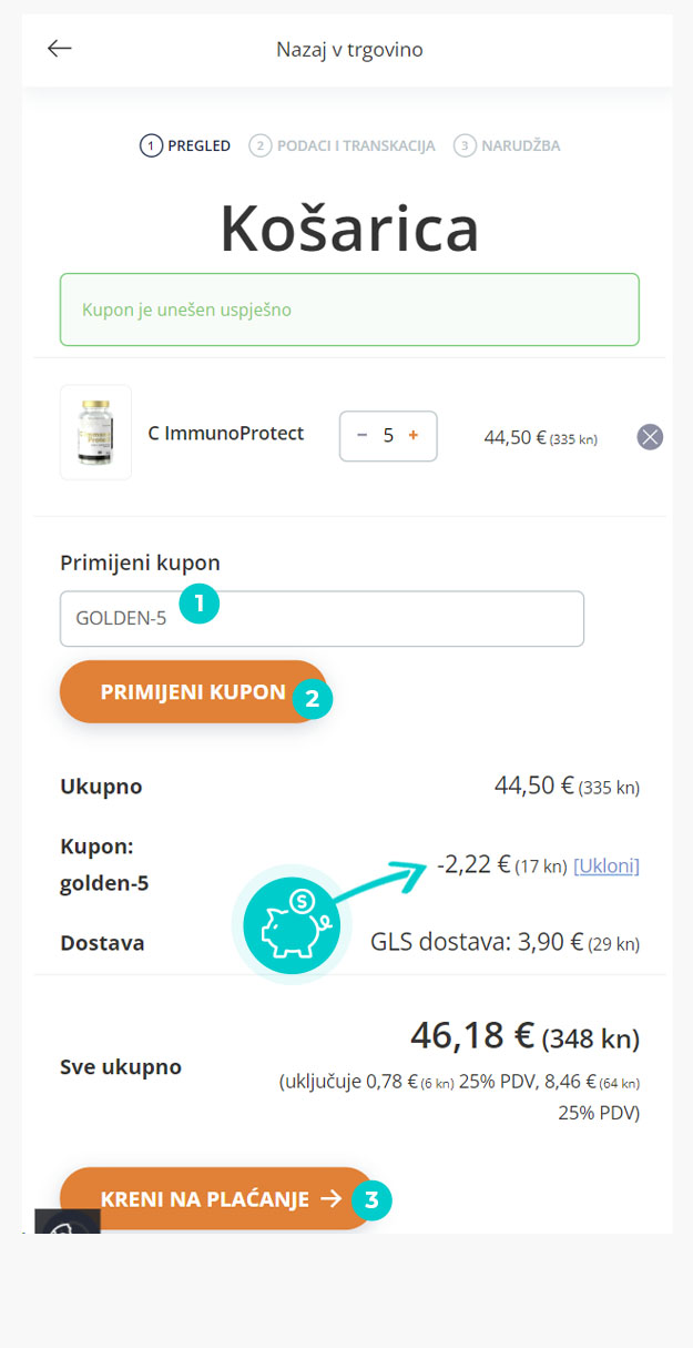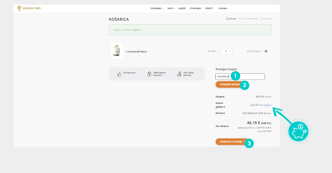 Na GoldenTree.hr odaberite željeni proizvod, dodajte ga u košaricu i otvorite pregled košarice. U odjeljku za naplatu pronaći ćete polje "Unesite kod za popust". Ovdje zalijepite ili ručno upišite kod i potvrdite klikom na "Primijeni".