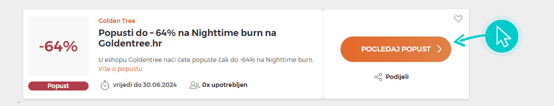 Na našoj stranici odaberite određeni GoldenTree popust i kliknite gumb "Pogledaj popust". Odmah ćete biti preusmjereni na posebnu promotivnu ponudu u GoldenTree.hr web trgovini, gdje možete kupiti proizvode po sniženim cijenama.
