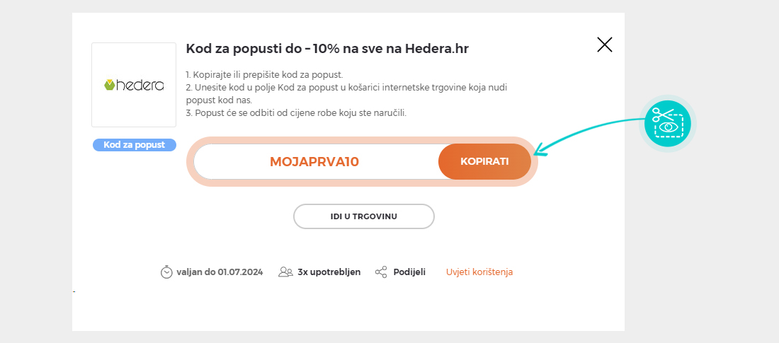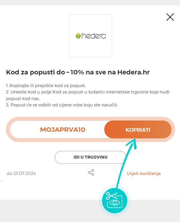 Kopirajte ili zapišite kod za popust i kliknite gumb "Idi u trgovinu". Zatim ćete biti preusmjereni izravno na Hedera.hr e-trgovinu.