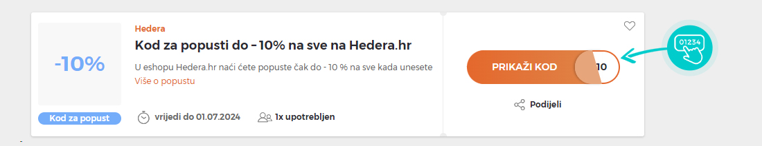 Odaberite određeni kod za popust na našoj web stranici koji želite koristiti u Hedera e-trgovini. Pritisnite narančasti gumb "Prikaži kod".