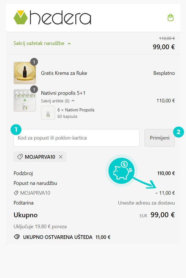 U e-trgovini Hedera.hr odaberite proizvod koji vas zanima, pritisnite gumb "Dodaj u košaricu" i proizvod će automatski biti dodan u košaricu. Izravno u košarici pronaći ćete polje "Unesite kod za popust" u odjeljku "Sažetak" s desne strane. Ovdje zalijepite kopirani kod za popust ili ga unesite ručno i potvrdite tipkom "Primijeni".