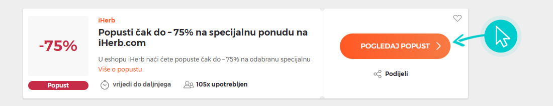 Odaberite iHerb akciju ili kupon s naše stranice i kliknite na "Pogledaj popust". Bit ćete automatski preusmjereni na odgovarajuću ponudu u iHerb internetskoj trgovini, gdje možete obaviti kupnju po sniženim cijenama.