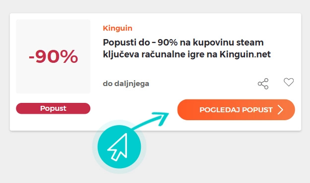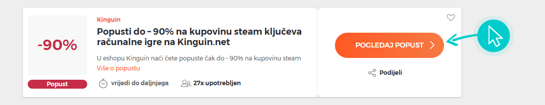 Odaberite određeni Kinguin popust na našoj web stranici i kliknite gumb "Pogledaj popust". Automatski ćete biti preusmjereni izravno na promotivnu ponudu u online trgovini Kinguin.net, gdje možete kupiti proizvod s popustom.