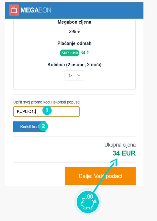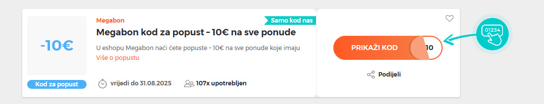U eshopu Megabon naći ćete popuste – 10€ na sve ponude koje imaju odjeljak za unos promo koda. Popust ostvarujete kada uneste kod za popust u košaricu. Iskoristite Megabon kod za popust i kupujte jeftinije.