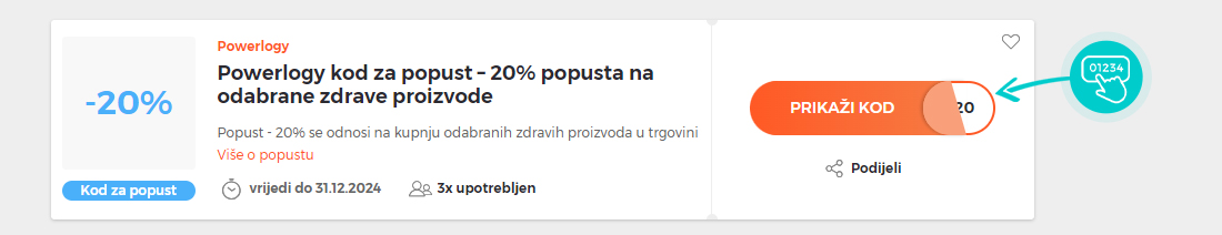 Odaberite određeni kod za popust na našoj web stranici koji želite koristiti u Powerlogy.eu e-trgovini. Pritisnite narančasti gumb "Prikaži kod".
