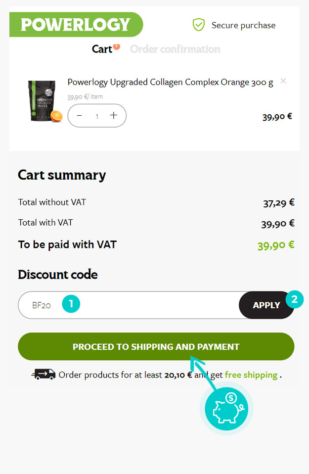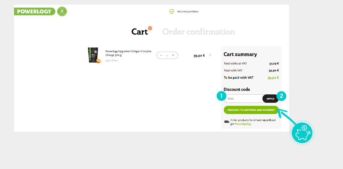 U e-trgovini Powerlogy.eu odaberite proizvod koji vas zanima, pritisnite gumb "Dodaj u košaricu" i proizvod će automatski biti dodan u košaricu. Izravno u košarici pronaći ćete polje "Unesite kod za popust" u odjeljku "Sažetak" s desne strane. Ovdje zalijepite kopirani kod za popust ili ga unesite ručno i potvrdite tipkom "Primijeni".