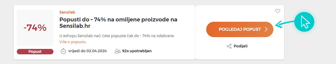 Odaberite određeni Sensilab popust na našoj web stranici i kliknite gumb "Pogledaj popust". Automatski ćete biti preusmjereni izravno na promotivnu ponudu u online trgovini Sensilab.hr gdje možete kupiti proizvod s popustom.