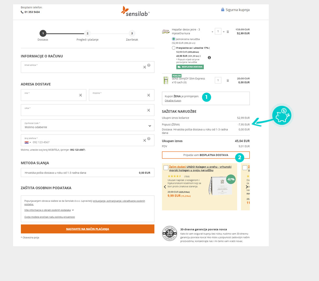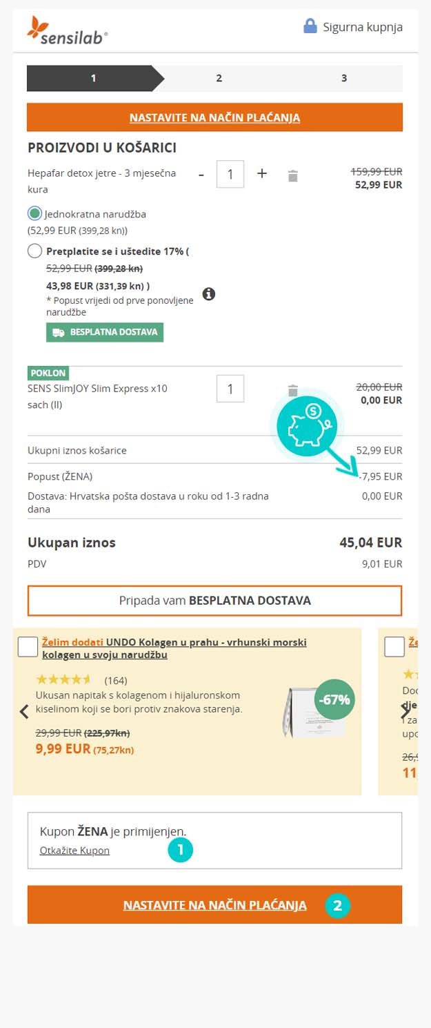 U e-trgovini Sensilab.hr odaberite proizvod koji vas zanima, pritisnite gumb "Dodaj u košaricu" i proizvod će automatski biti dodan u košaricu. Izravno u košarici pronaći ćete polje "Unesite kod za popust" u odjeljku "Sažetak" s desne strane. Ovdje zalijepite kopirani kod za popust ili ga unesite ručno i potvrdite tipkom "Primijeni".