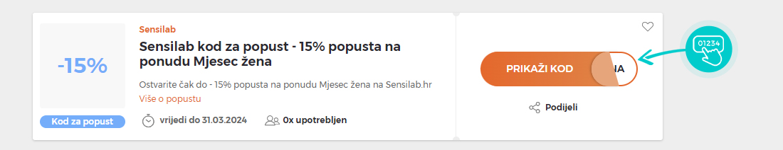 Odaberite određeni kod za popust na našoj web stranici koji želite koristiti u Sensilab.hr e-trgovini. Pritisnite narančasti gumb "Prikaži kod".