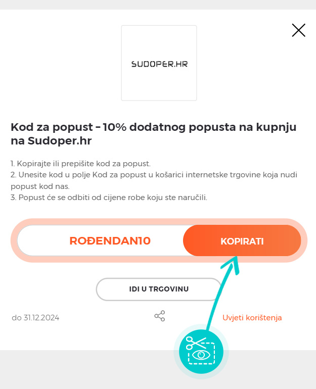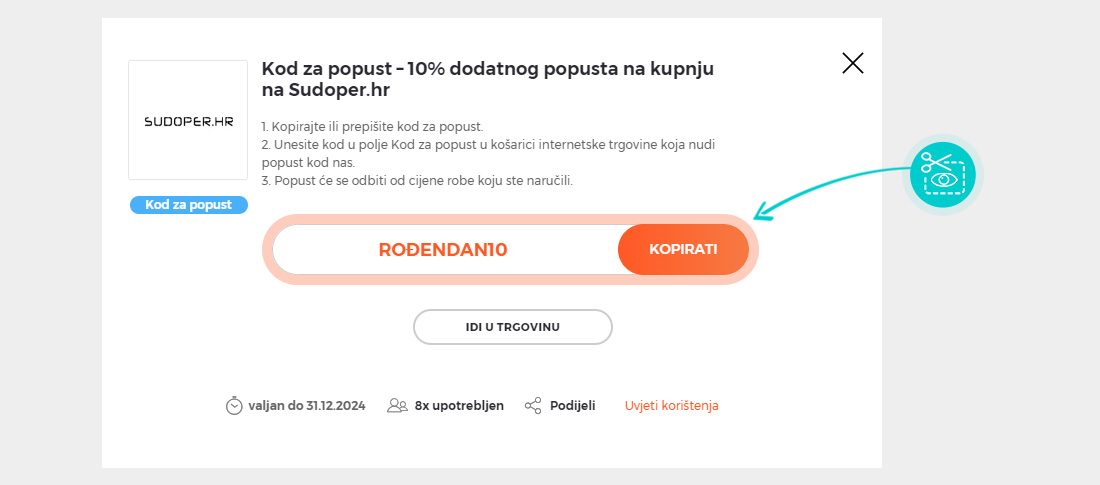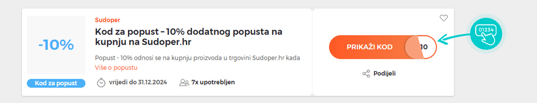 Odaberite određeni kod za popust na našoj web stranici koji želite koristiti u Sudoper.hr e-trgovini. Pritisnite narančasti gumb "Prikaži kod".