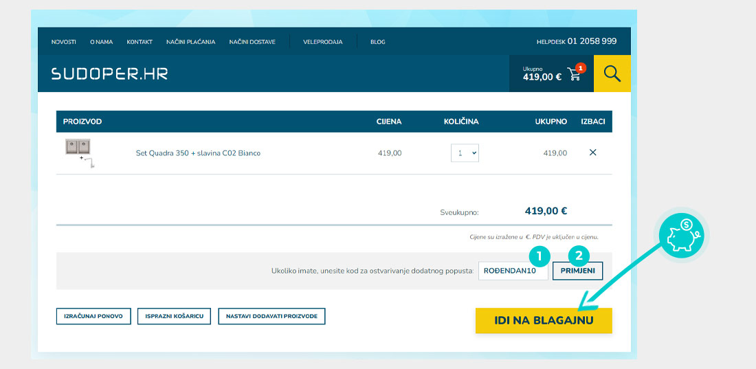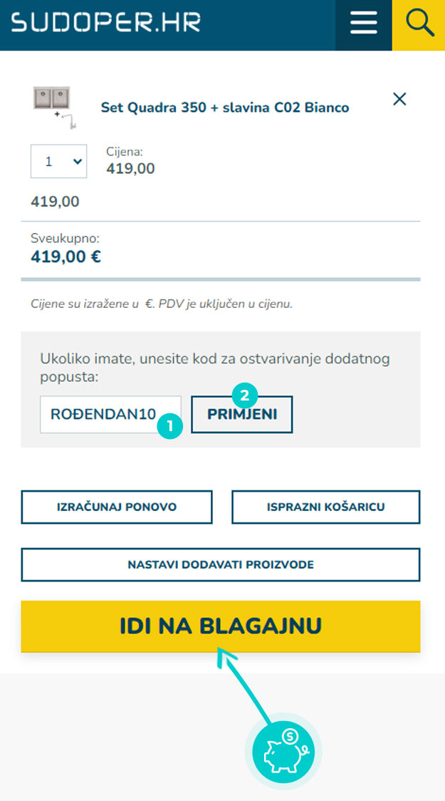 Ne znate kako točno funkcioniraju kodovi za popust na Sudoper.hr? Nudimo vam postupak kako možete brzo i jednostavno primijeniti kodove za popust prilikom kupnje: