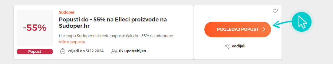 Odaberite određeni Sudoper.hr popust na našoj web stranici i kliknite gumb "Pogledaj popust". Automatski ćete biti preusmjereni izravno na promotivnu ponudu u online trgovini Sudoper.hr, gdje možete kupiti proizvod s popustom.