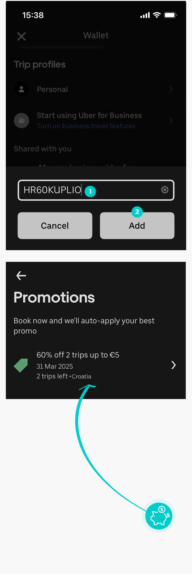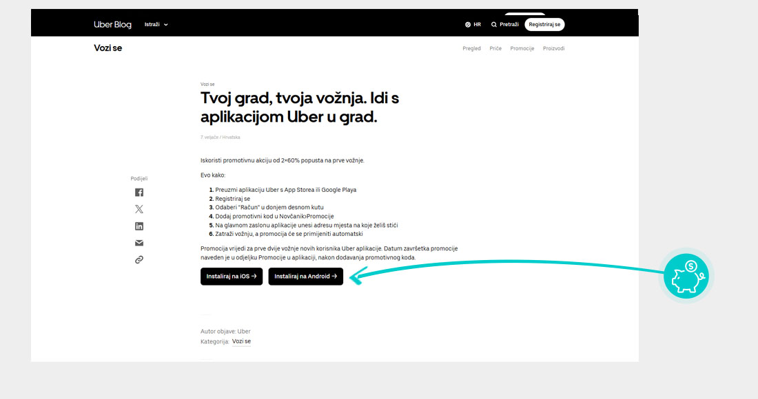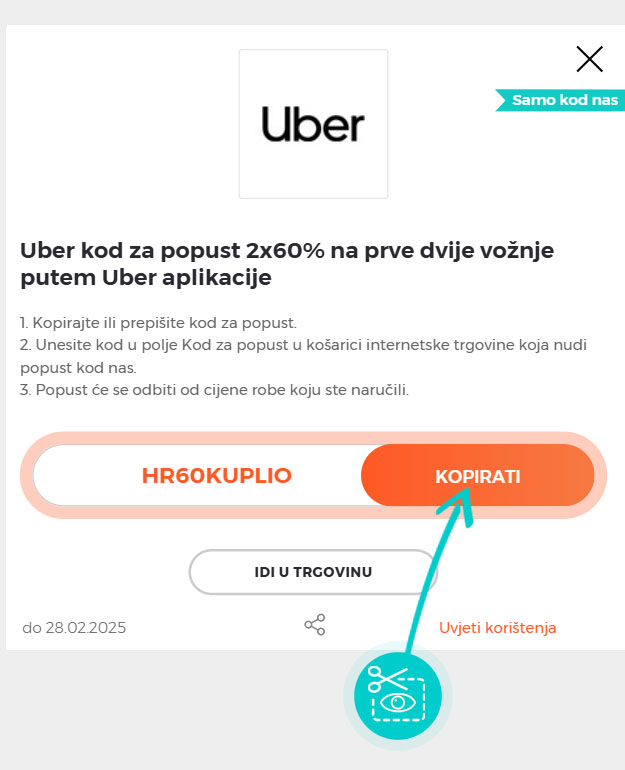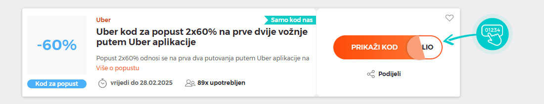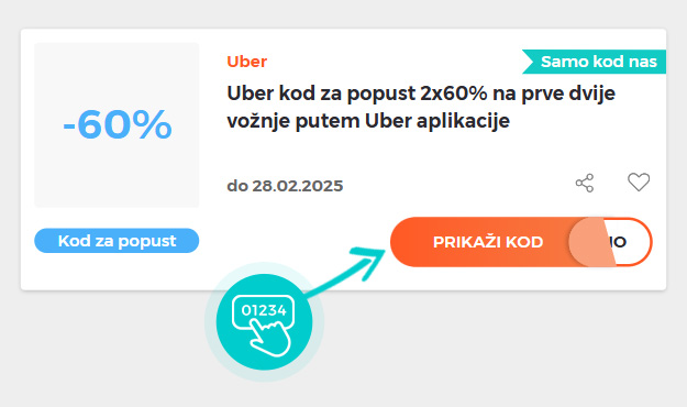 Popust 2x60% odnosi se na prva dva putovanja putem Uber aplikacije na Uber.com kada unesete kod za popust u košaricu. Iskoristite popust Uber i kupite proizvode iz asortimana jeftinije. Više informacija naći ćete nakon klika. Detalji u aplikaciji nakon prijave promocije.