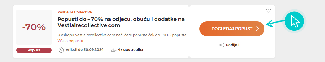 Odaberite određeni Vestiairecollective popust na našoj web stranici i kliknite gumb "Prikaži popust". Automatski ćete biti preusmjereni izravno na promotivnu ponudu u Vestiairecollective.com online trgovini, gdje možete kupiti proizvod s popustom.