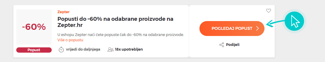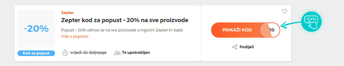 Odaberite određeni kod za popust na našoj web stranici koji želite koristiti u Zepter.hr e-trgovini. Pritisnite narančasti gumb "Prikaži kod".