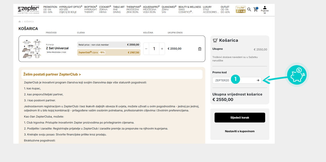 U e-trgovini Zepter.hr odaberite proizvod koji vas zanima, pritisnite gumb "Dodaj u košaricu" i proizvod će automatski biti dodan u košaricu. Izravno u košarici pronaći ćete polje "Unesite kod za popust" u odjeljku "Sažetak" s desne strane. Ovdje zalijepite kopirani kod za popust ili ga unesite ručno i potvrdite tipkom "Primijeni".